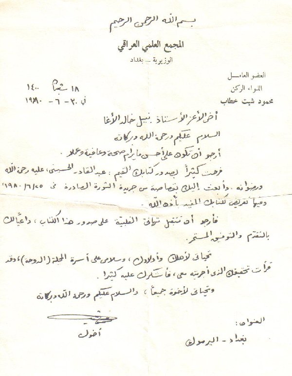 تلقيت هذه التهنئة القيمة من أستاذي وصديقي المفكر العربي الإسلامي المرحوم محمود شيت خطاب بمناسبة صدور كتابي الذي صدر في بيروت في العام ١٩٨١م بعنوان: الشهيد الحي عبدالقادر الحسيني: قضية فلسطين في سيرة بطل. النص الحرفي للرسالة: بسم الله الرحمن الرحيم المجمع العلمي العراقي الوزيرية – بغداد, العضو العامل اللواء الركن محمود شيت خطاب, ١٨ شعبان ١٤٠٠ هـ في ٣٠ - ٦ - ١٩٨٠م. أخي الأعز الأستاذ نبيل خالد الأغا السلام عليكم ورحمته وبركاته, أرجو أن تكون على أحسن ما يرام صحة وعافية وعملاً, فرحت كثيراً بصدور كتابك القيم: عبدالقادر الحسيني عليه رحمة الله ورضوانه، وأبعث إليك بقصاصة من جريدة الثورة الصادرة في 28/6/1980م وفيها تقريظ بكتابك المفيد بإذن الله. فأرجو أن تتقبل تهاني القلبية على صدور هذا الكتاب، داعياً لك بالتقدم والتوفيق المستمر. تحياتي لأهلك وأولادك، وسلامي على أسرة المجلة (الدوحة)، وقد قرأت تحقيقك الذي أجريته معي، فأشكرك عليه كثيراً. وتحياتي للأخوة جميعا، والسلام عليكم ورحمة الله وبركاته. أخوك، توقيع. بغداد، اليرموك.