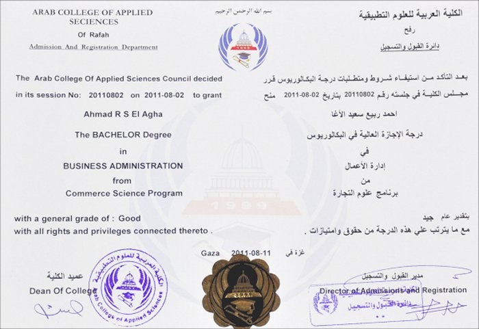 من الكلية العربية للعلوم التطبيقية بتقدير عام جيد، وألف مبارك .