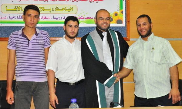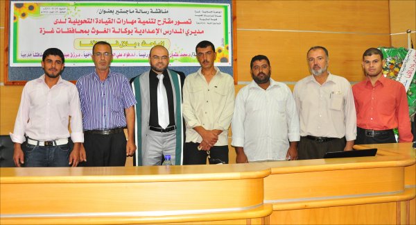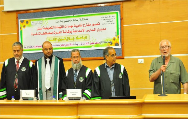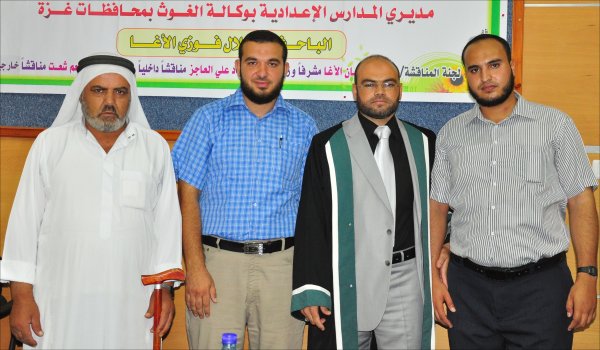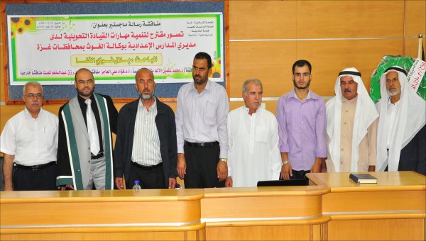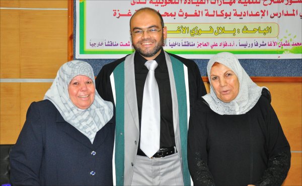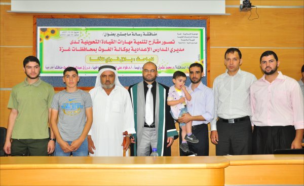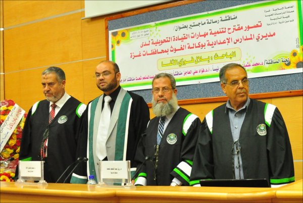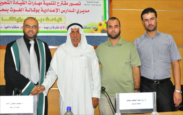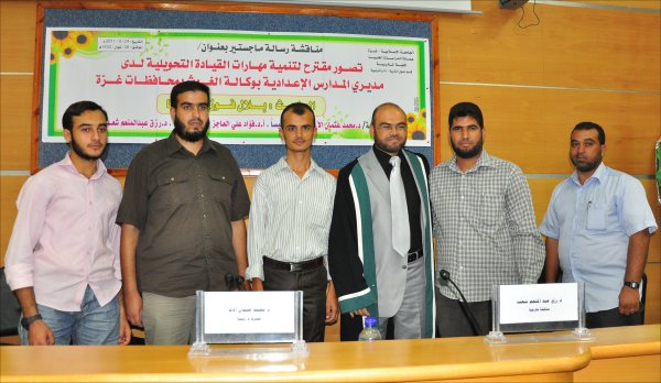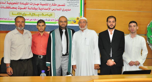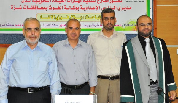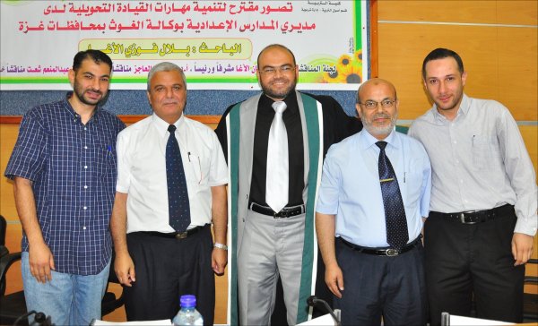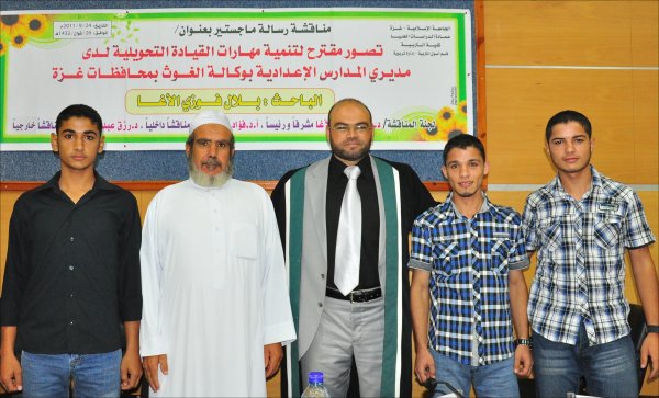 قاعة المؤتمرات- الجامعة الإسلامية خان يونس(فرع الجنوب)، السبت الموافق 24-09-2011 حصل الأستاذ بلال فوزي جبارة الأغا، على رسالة ماجستير بعنوان تصور مقترح لتنمية مهارات القيادة التحويلية لدى مديري المدارس الإعدادية بوكالة الغوث بمحافظات قطاع غزة وتكونت اللجنة من: أ. د. محمد عثمان الأغا(مشرفاً ورئيساً)، أ. د. فؤاد علي العاجز(مناقشاً داخلياً)، د. رزق عبدالمنعم شعت(مناقشا خارجياً).