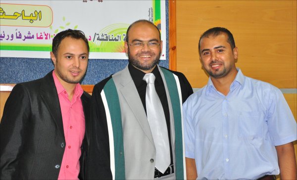 السادة: د. رزق عبدالمنعم شعت(مناقشاً خارجياً)، د. محمد عثمان الأغا(مشرفاً ورئيساً)،