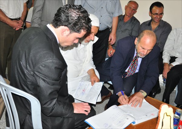 السادة: والد العروس، المأذون الشرعي، العَلِيان: أ. علي محمد الأغا، أ. علي يوسف الأغا،