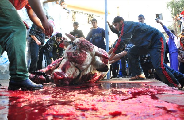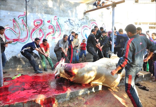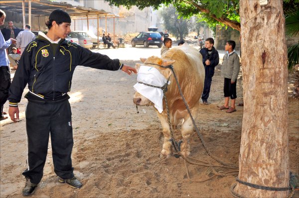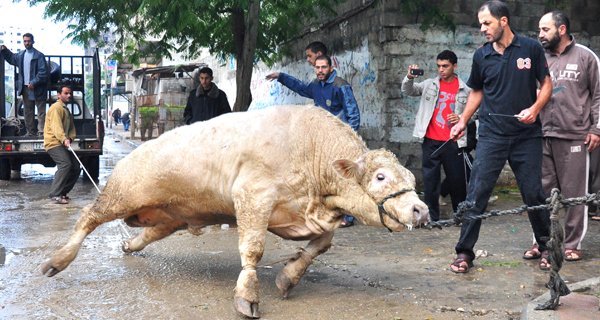 أحد المواطنين يراوغ أحد العجول ليذبحه
