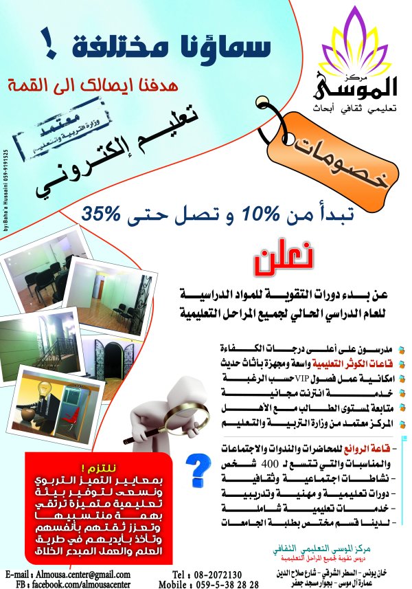 تم بحمد الله إختتام الدورة المجانية بعنوان (رخصة قيادة الذات) بمركز الموسى التعليمي، والتي عقدت على مدار 4 أيام بتاريخ : 13-2001/11/16، بالتعاون مع مركز الفالوجا الثقافي ، وقد قام بالتدريب المدرب الأستاذ / محمود أبو شر عضو المركز العالمي الكندي.