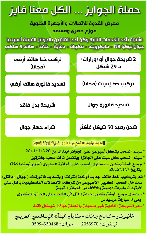 الرئيسة/إعلانات /حملة الجوايز..الكل معنا فايز..معرض القدوة للإتصالات إعلانات حملة الجوايز..الكل معنا فايز..معرض القدوة للإتصالات تاريخ النشر : الأربعاء | 23-11-2011 | 19:12 7516 اضغط هنا للتواصل أو التعرف على أ. محمد منير حمدي حسين الأغا يمكنك تلقي أحدث الأخبار أول بأول بانضمامك لإحدى مجموعات الواتساب الخاصة بالعائلة من خلال الضغط هنـا اظهر المزيد