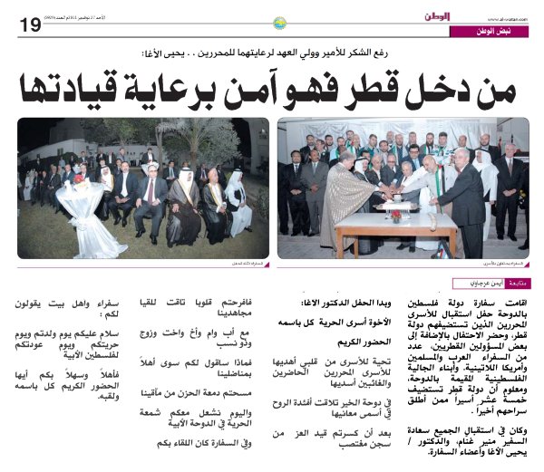 الدوحة- الأربعاء 23-11-2011 أقامت السفارة الفلسطينية بالدوحة حفلاً على شرف الأسرى المحررين من سجون الإحتلال، شارك فيه عدد من الشخصيات الرسمية والشعبية