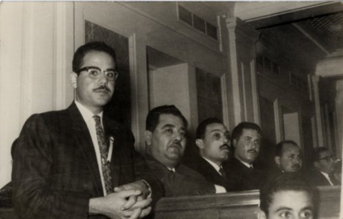افتتاح ندوة فلسطين العالمية بجامعة القاهرة ١٩٦٥، ويبدو إلى الشمال كاتب المقال وإلى شماله اللواء وجيه المدني قائد جيش التحرير الفلسطيني ومجموعة من الضباط