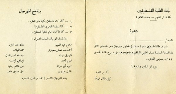 لجنة أبناء فلسطين في كلية دار العلوم، وهم: صالح أبو أصبع، المرحومة شاهيناز استيتية، عز الدين المناصرة، نبيل خالد الأغا