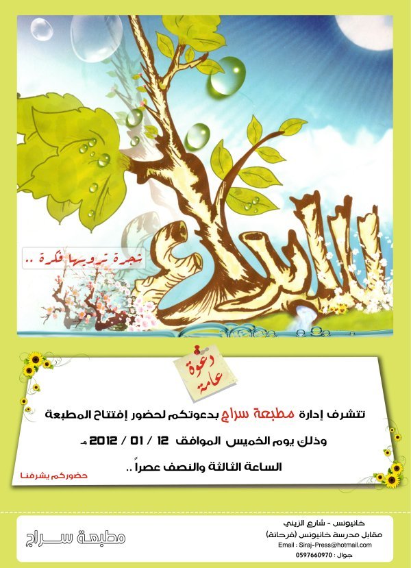 الرئيسة/إعلانات /دعوة عامة لحضور إفتتاح مطبعة سراج إعلانات دعوة عامة لحضور إفتتاح مطبعة سراج تاريخ النشر : الثلاثاء | 10-01-2012 | 11:12 9533 لصاحبها كل من ربيع سعيد الأغا، محمد باسم شكري الأغاإدارة: المصمم: محمد باسم شكري الأغا اضغط هنا للتعرف على الشهيد محمد باسم شكري ديب شاكر الأغا يمكنك تلقي أحدث الأخبار أول بأول بانضمامك لإحدى مجموعات الواتساب الخاصة بالعائلة من خلال الضغط هنـا اظهر المزيد