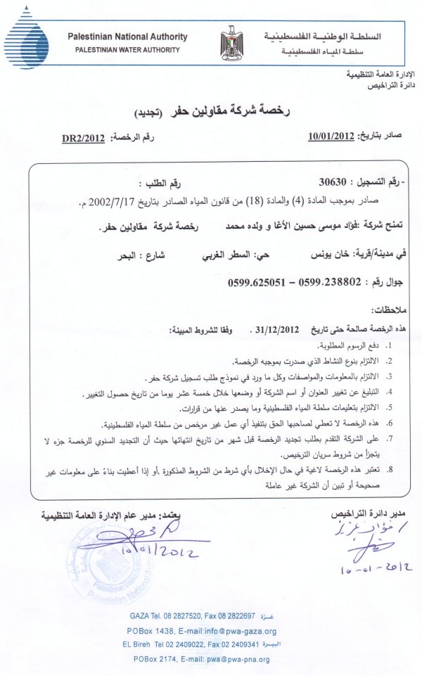 منزل السيد فؤاد موسى الأغا- السطر الغربي- خان يونس- الجمعة 03-02-2012 تم بحمد الله افتتاح شركة فؤاد موسى الأغا وولده محمد لحفر الآبار بعد الحصول على التراخيص اللازمة لمزاولة المهنة ، وبهذه المناسبة تم دعوة الأصدقاء والأحباب وأصحاب العلاقة لتناول واجب الضيافة بمناسبة الافتتاح.