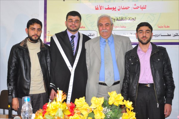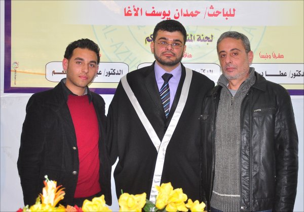 د. علي نصار(مناقشاً داخلياً)، والد الباحث، أ. عمر عودة الأغا،