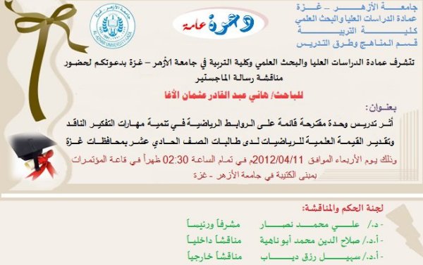 الرئيسة/رسالة ماجستير/دعوة عامة لحضور مناقشة رسالة ماجستير للباحث هاني عبدالقادر عثمان الأغا رسالة ماجستير دعوة عامة لحضور مناقشة رسالة ماجستير للباحث هاني عبدالقادر عثمان الأغا تاريخ النشر : الثلاثاء | 10-04-2012 | 18:41 12345 اضغط هنا للتواصل أو التعرف على الدكتور هاني عبدالقادر عثمان حسن قاسم الأغا يمكنك تلقي أحدث الأخبار أول بأول بانضمامك لإحدى مجموعات الواتساب الخاصة بالعائلة من خلال الضغط هنـا اظهر المزيد