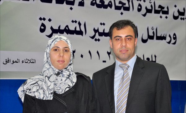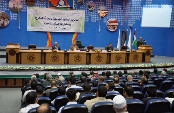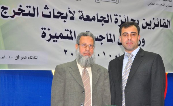 قاعة المؤتمرات الكبرى- الجامعة الإسلامية غزة- الثلاثاء الموافق 10-04-2012 احتفلت شئون البحث العلمي بالجامعة الإسلامية بتكريم الفائزين بجائزة الجامعة لأبحاث التخرج ورسائل الماجستير المتميزة للعام الدراسي 2010-2011م، بحضور معالي النائب جمال ناجي الخضري –رئيس مجلس الأمناء بالجامعة، والدكتور كمالين كامل شعث –رئيس الجامعة، والدكتور طالب أبو شعر –نائب رئيس الجامعة لشئون البحث العلمي، والأستاذ الدكتور محمد مقداد، والدكتور أيمن السقا –مساعدا نائب رئيس الجامعة لشئون البحث العلمي، وحضر الحفل أعضاء من مجلسي الأمناء والجامعة، وجمع من عمداء الكليات بالجامعة، وممثلون عن الجامعات والمؤسسات والجمعيات والمراكز التي تُعنى بالبحث العلمي، وأعضاء هيئة التدريس وكان من بين المحتفى بهم :