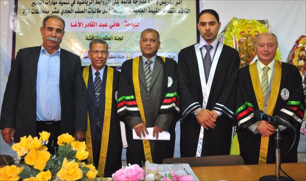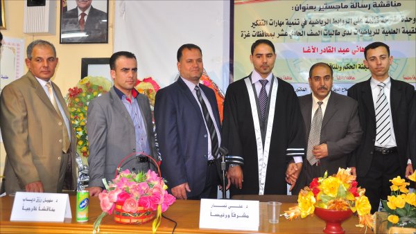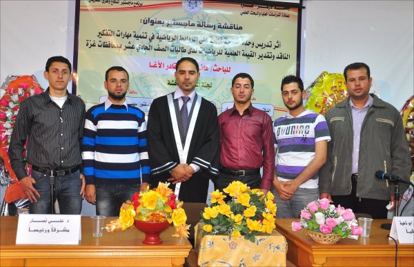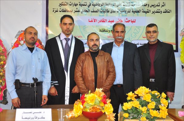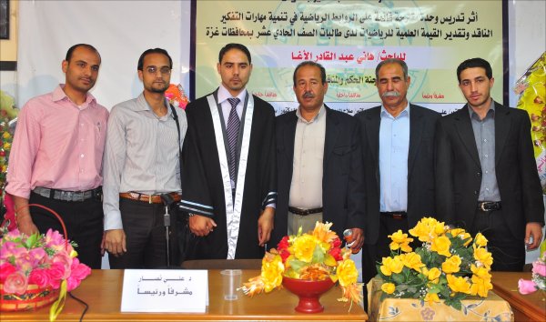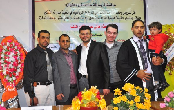 أ. علاء أبو جراد، والد الباحث، السيد: صلاح الأغا، الباحث، أ. أحمد أبو عطا، أ. أحمد العجوري