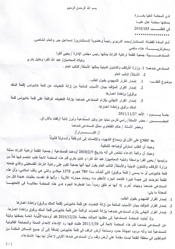 وحيث أن واقعة الإدعاء تخلص في أنه بتاريخ 9/2/2010 أودعت المستدعية جمعية القلعة لرعاية التراث ممثلة برئيسها/ يحيى الفرا بواسطة وكيليه المحاميين/ عبدالله الفرا وخليل بكري قلم هذه المحكمة لائحة طلب إختصم فيهما كلاً من وزارة الأوقاف والشئون الدينية والأستاذ/ النائب العام يقول فيها أنها جمعية تقوم على رعاية التراث الفلسطيني والذي ضمنه قلعة خان يونس أو ما يسمى( قلعة برقوق) التي أنشأت سنة 789 هجري 1378 ميلادي والتي هي وقف إسلامي، وأن هذه القلعة تعرضت إلى هجمة كبيرة إقتلعت الجزء الأعظم منه وبددت حجارته الأثرية، وأنها قد تقدمت بطلبات عديدة لكل من المستدعى ضدهما وجهات أخرى، إلا أنها لم تتلق ردوداً مما إضطرها للجوء لدى هذه المحكمة مطالبة في لائحتها المعدلة ما يلي: