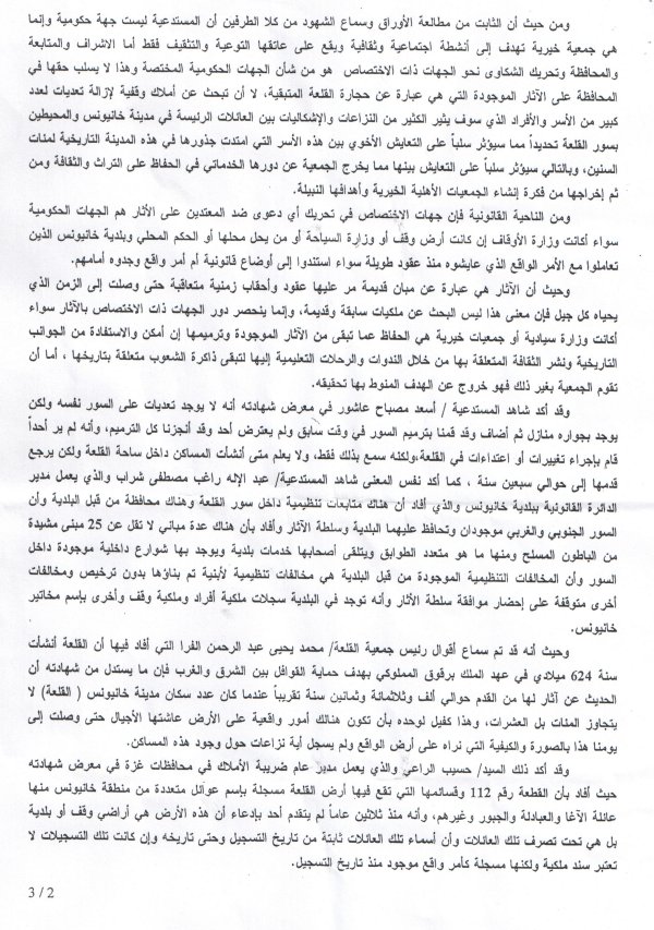 وقد أكد شاهد المستدعية / أسعد مصباح عاشور في معرض شهادته أنه لايوجد تعديات على السور نفسه لكن يوجد بجواره منازل ، ثم اضاف وقد قمنا بترميم السور في وقت سابق ولم يعترض أحد وقد أنجزنا كل الترميم ، وأنه لم ير أحدا قام بإجراء تغييرات أو إعتداءات في القلعة ولكنه سمع بذلك فقط ، ولا يعلم متى أنشأت المساكن داخل ساحة القلعة ولكن يرجع قدمها إلى حوالي سبعبن سنة ، كما أكد نفس المعنى المستدعية / عبد الإله راغب مصطفى شراب والذي يعمل مدير الدائرة القانونية ببلدية خانيونس والذي أفاد أن هناك متابعات تنظيمية داخل سور القلعة ، وهناك محافظة من قبل البلدية وأن السور الجنوبي والغربي موجودان وتحافظ عليهما البلدية وسلطة الآثار وأفاد بأن هناك عدة مباني لا تقل عن 25 مبنى مشيدة من الباطون المسلح ومنها ما هو متعدد الطوابق ويتلقى أصحابها خدمات بلدية ، ويوجد بها شوارع داخلية موجودة داخل السوروأن المخالفات التنظيمية الموجودة من قبل البلدية هي مخالفات تنظيمية لأبنية تم بناؤها بدون ترخيص ومخالفات أخرى متوقفة على إحضار موافقة سلطة الآثار وأنه توجد في البلدية سجلات ملكية أفراد وملكية وقف وأخرى بإسم مخاتير خانيونس.