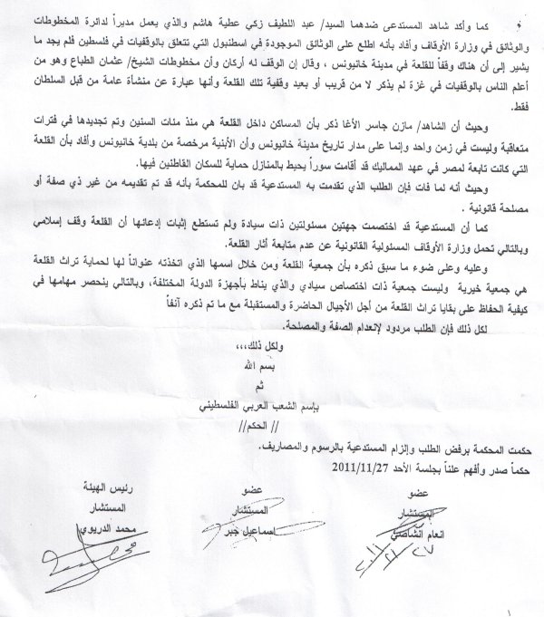 كما وأكد المستدعى ضدهما السيد/ عبداللطيف عطية هاشم والذي يعمل مديراً لدائرة المخطوطات والوثائق في وزارة الأوقاف وأفاد بأنه اطلع على الوثائق الموجودة في إسطنبول التي تتعلق بالوقفيات في فلسطين فلم يجد ما يشير إلى أن هناك وقفاً للقلعة في مدينة خان يونس، وقال إن الوقف له أركان وأن مخطوطات الشيخ/ عثمان الطباع وهو من أعلم الناس بالوقفيات في غزة لم يذكر لا من قريب ولا من بعيد وقفية تلك القلعة وأنها عبارة عن منشأة عامة من قبل السلطان فقط.