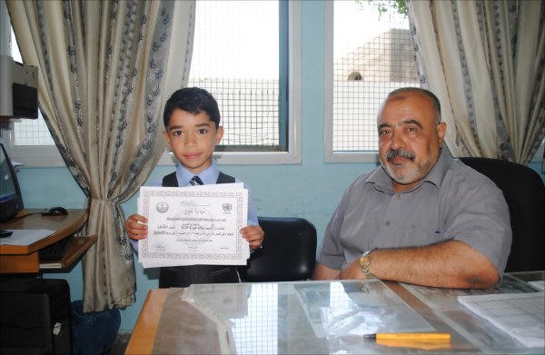 أ. عيسى شامية النائب الإداري لمدرسة القرارة، المتفوق أحمد خالد الأغا