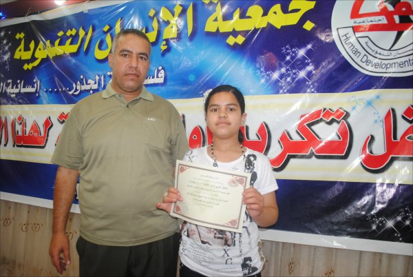 صالة دريم- القرارة- محافظة خان يونس- الثلاثاء الموافق 19-06-2012 أقامت جمعية الإنسان التنموية احتفالا لتكريم أوائل الطلبة المتفوقين في منطقة القرارة، وأوضح مدير الجمعية أ. إبراهيم خشان أن المؤسسة تسعى دائماً لتعزيز وتفعيل المشاركة المجتمعية من خلال الأنشطة التطوعية الهادفة وبالتنسيق مع مؤسسات المجتمع المدني والمؤسسات الداعمة، وجاء هذا الاحتفال لتكريم أوائل الطلبة في مدارس منطقة القرارة، وبحمد الله وتوفيقه حظي لبعض طلبتنا المتفوقين على هذا التكريم: