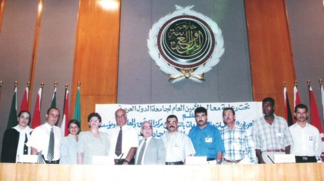 صورة من الارشيف للفقيد خلال مؤتمر بالقاهرة يظهر وسط اعضاء من الهيئة الاكاديمية بجامعة الاقصى