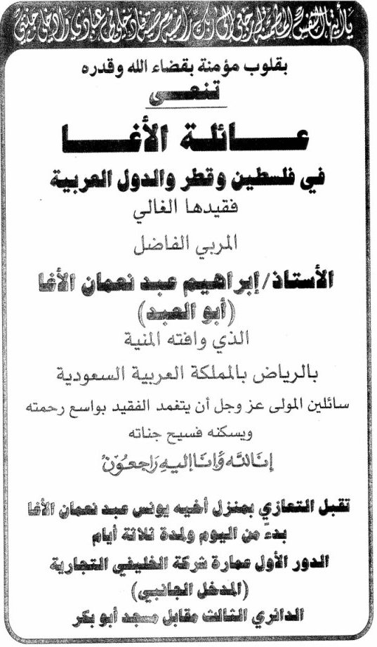 بقلوب مؤمنة بقضاء الله وقدره تنعى عائلة الأغا في الوطن والشتات بوفاة