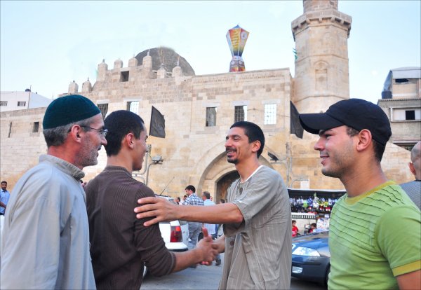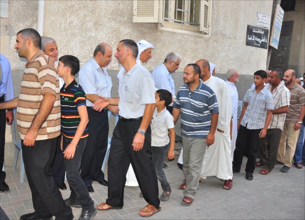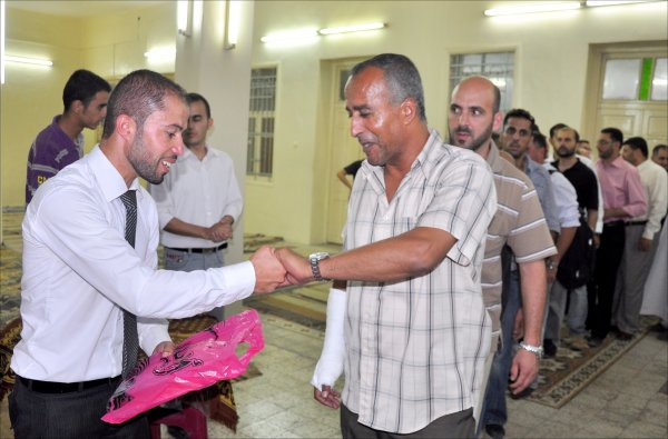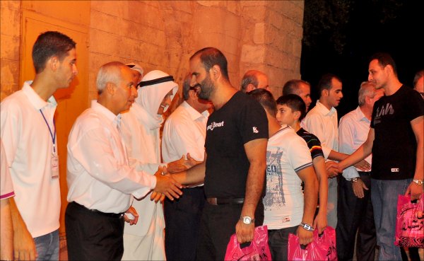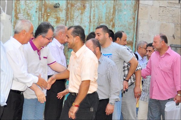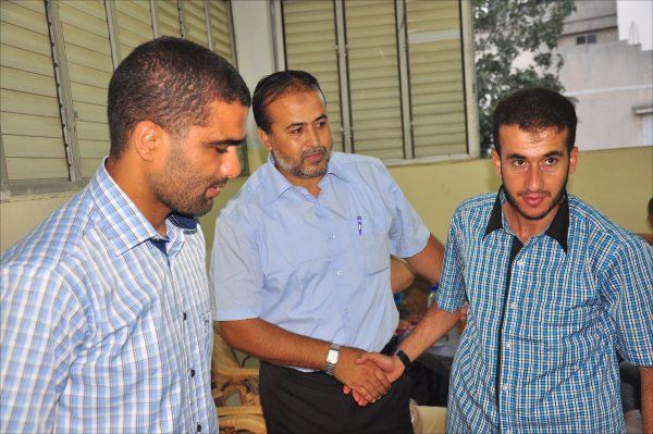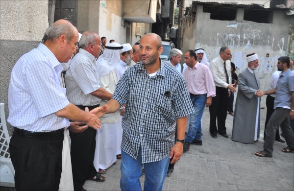 في الوسط الأسير المحرر أمجد الأغا يصافح أصدقاء الاسر