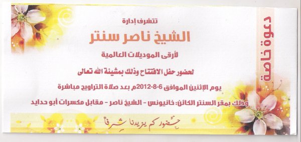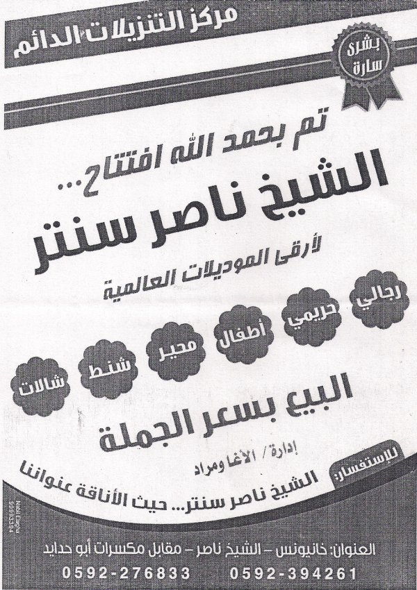 الرئيسة/إعلانات /دعوة عامة لحضور افتتاح الشيخ ناصر سنتر للملابس الجاهزة إعلانات دعوة عامة لحضور افتتاح الشيخ ناصر سنتر للملابس الجاهزة تاريخ النشر : الإثنين | 06-08-2012 | 00:44 18726 بسم الله الرحمن الرحيمإدارة: أ. كرم احمد كامــــــل الأغا أ. محمد صبحي جبارة الأغا اضغط هنا للتواصل أو التعرف على أ. محمد صبحي جبارة فالوجي الأغا يمكنك تلقي أحدث الأخبار أول بأول بانضمامك لإحدى مجموعات الواتساب الخاصة بالعائلة من خلال الضغط هنـا اظهر المزيد