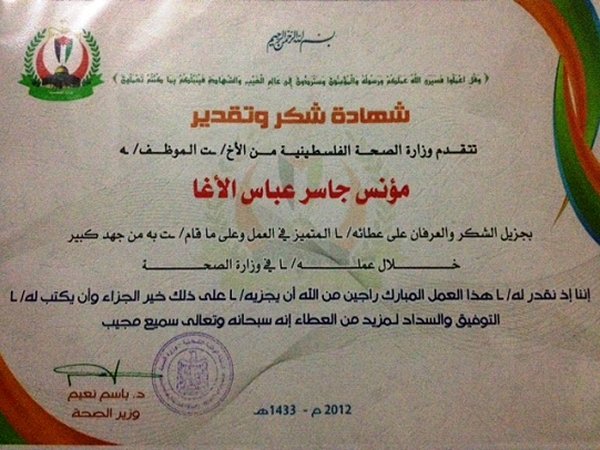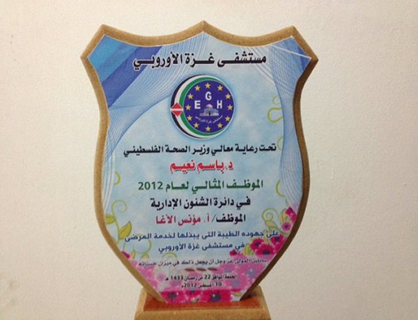 في مساء يوم الجمعة الموافق 10/8/2012- القرية المائية في مدينة أصداء / خان يونس، وبحضور شخصيات من وزارة الصحة ومؤسسات المجتمع، تم تكريم بعض الموظفون ومن بينهم المحاسب / أ. مؤنس جاسر عباس الأغا، بمناسبة حصوله على لقب الموظف المثالي في مستشفى غزة الأوروبي لعام 2012م.
