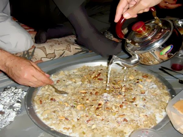 ويتم تزيينها بالجوز، واللوز، والكاجو، والمكسرات الأخري، والسمن البلدي والحليب وغيرها، وقد أستحدثت فى الآونة الأخيرة بعض المقبلات معها مثل الحمص ، وبابا غنوج، ومتبلات، وسلطات، والفسيخ وغيره، مما أضفى عليها نوعاً من التراث الفلسطيني الأصيل، ويليها تقديم الفواكه المحلية، وشرب القهوة العربية، سائلين الله أن يجزي الجميع خير الجزاء.