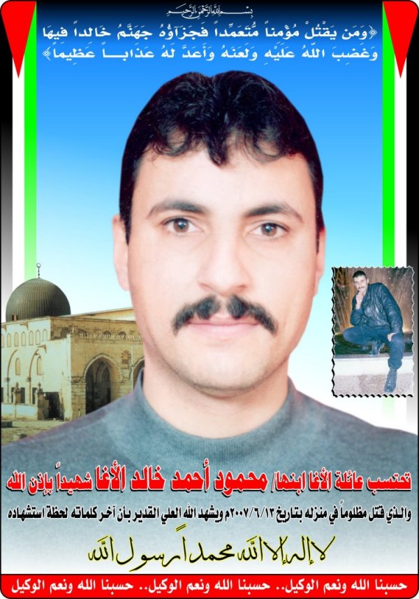 الذي انتقل إلى رحمة الله تعالى ظهر يوم الأربعاء الموافق 13-06-2007 بمنطقة البلد بخان يونس، 33 عاما، بعد إصابته برصاصة غادرة في أسفل الرقبة اخترقت جسده الطاهر، بينما كان واقفا على سطح منزله الكائن بالقلعة برفقة زميله السيد شريف احمد يوسف الأغا الذي أصيب بدوره بشظايا رصاصة أخرى في يده، وذلك خلال الأحداث الجارية بقطاع غزة، رحم الله الفقيد رحمة واسعة واسكنه فسيح جناته.
