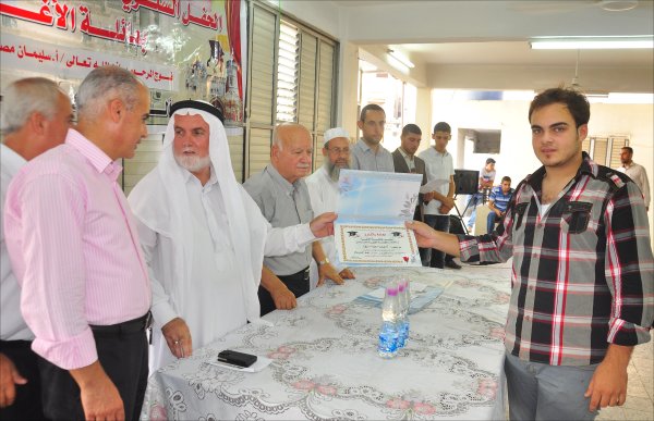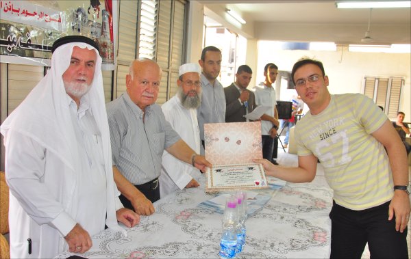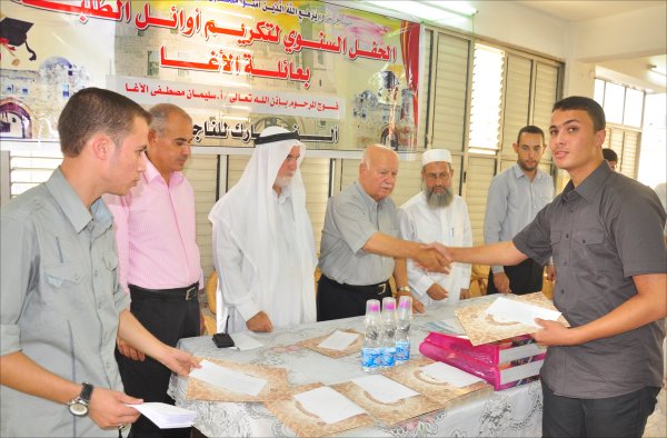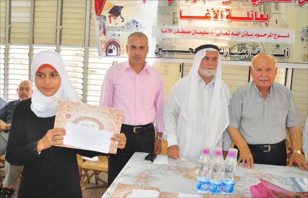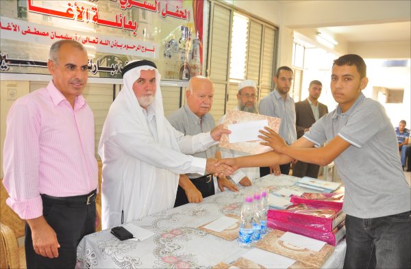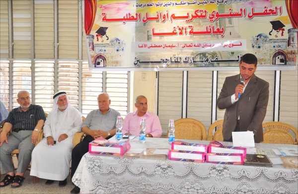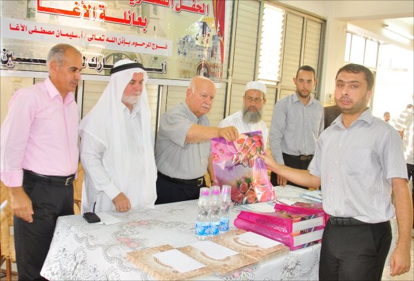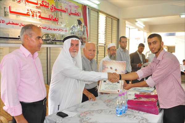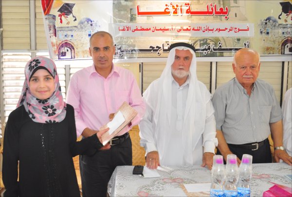 ديوان عائلة الأغا- القلعة - الأربعاء الموافق 29-08-2012، احتفلت عائلة الأغا بتكريم المرحلة الثانية من أبنائها المتفوقين بحضور الشخصيات الاعتبارية و الطلبة المتفوقين وذويهم ، وكان الاحتفال تكريما لروح الفقيد المرحوم بإذن الله تعالى أ. سليمان مصطفى الأغا، وبدأ الاحتفال بآيات عطرة من القران الكريم تلاها الحافظ لكتاب الله رمضان عبدالفتاح الأغا، ورحب عريف الحفل محمد فضل عطا الأغا بالحضور الكريم، وتحدث د. إياد محمد الأغا في كلمة العائلة عن عراقة العائلة وأصالتها وأنها دائماً السباقة في كل الميادين على الصعيدين الخارجي والداخلي وهنأ الطلبة المحتفى بهم وحثهم على المزيد من البذل والتفاني والحصول على أعلى الدرجات ، ووجه شكر للجنة المنظمة والداعمة لهذا الاحتفال، وفي نهاية الإحتفال تم تكريم المتفوقين .