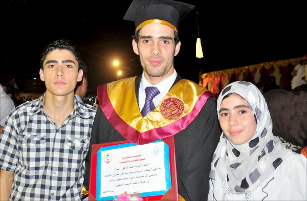 الخريج يتوسط شقيقته سارة وشقيقه هاشم