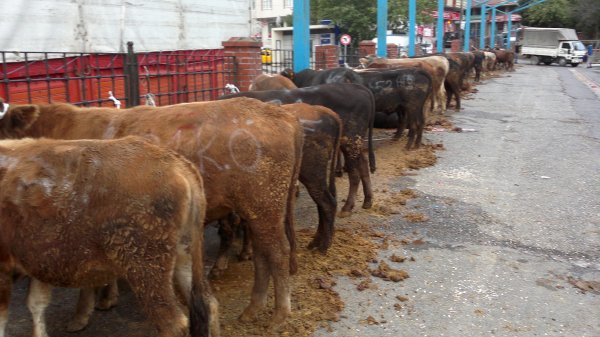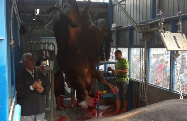 ذبح العجول يتم داخل مكان خاص بعد تعليقه من رجله الخلفية