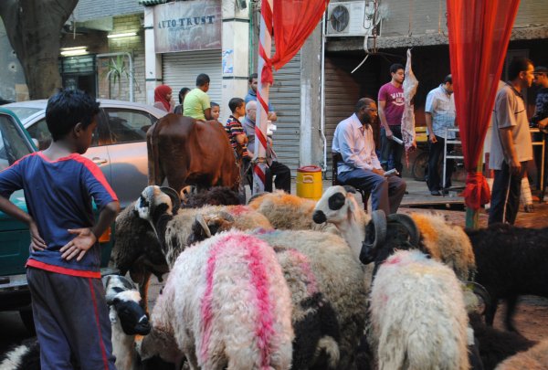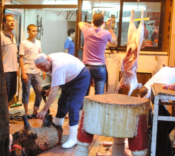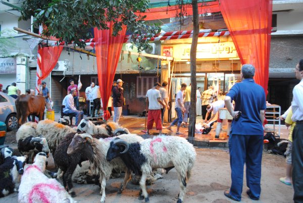 مواطنوان ينتظرون نحر اضاحيهم عند الجزار