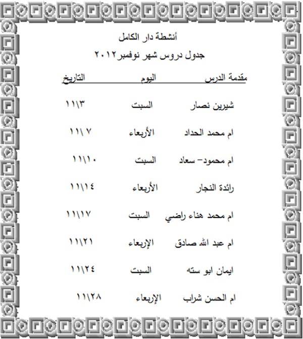 الرئيسة/دار الكامل/أنشطة دار الكامل لشهر نوفمبر دار الكامل أنشطة دار الكامل لشهر نوفمبر تاريخ النشر : الجمعة | 02-11-2012 | 01:45 9601 اضغط هنا للتواصل أو التعرف على أ. محمد كامل عبدالرحمن سليم الأغا يمكنك تلقي أحدث الأخبار أول بأول بانضمامك لإحدى مجموعات الواتساب الخاصة بالعائلة من خلال الضغط هنـا اظهر المزيد
