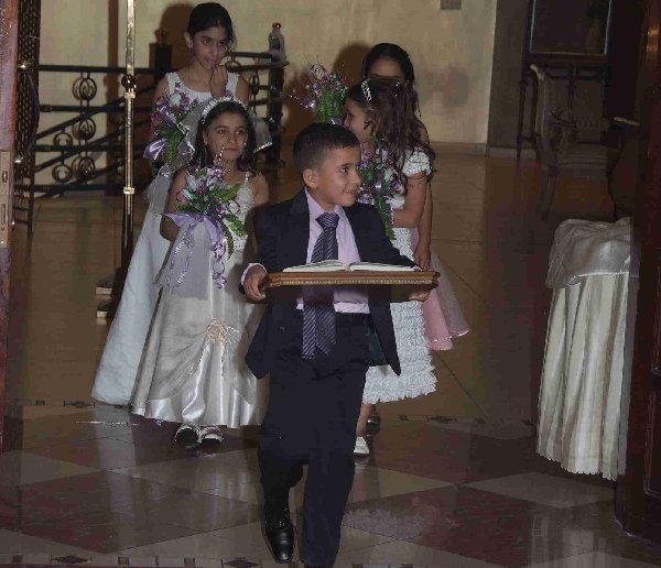 الأطفال يحملون المصحف الكريم والورود أمام العروسين