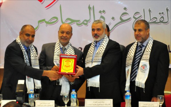 أ. إسماعيل هنية، د. محمد عبدالجواد(نقيب الصيادلة مصر)، د. خليل أبوليلة(نقيب الصيادلة غزة)،
