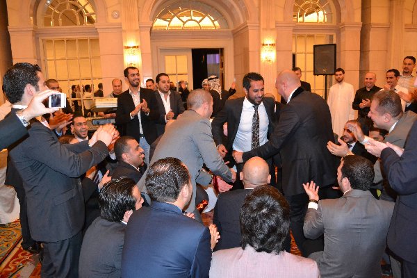 بوجوه طلقة بشوشة وبهمم الرجال العالية كان في استقبال المدعوين الكرام والد العريس "أ.سفيان غانم" وشقيقه م. طارق يداً بيد مع أشقاء العريس أحمد ومحمد وعبدالرحمن "وجلهم من منزلة العريس قريب والعاقبة لكم" وابن خالته الدكتور عمرو ياسين الأسطل، وأصهاره المهندس إياس الخطيب وعائلته الكريمة، والفاضل بهاء الفار وذووه الأفاضل الذين بذلوا مجهوداً يشكرون عليه ليكون الزفاف مميزاً وذا طابع خاص..