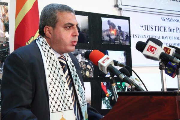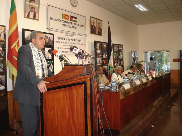 \و قد ألقى د. أنـور الأغـا سفير دولة فلسطين لدى سريلانكا و المالديف عميد السلك الدبلوماسي العربي و الأجنبي، كلمة بهذه المناسبة، تطرقت خلالها إلى تاريخ القضية الفلسطينية، و المحطات الأساسية التي مرت بها، في ظل الإحتلال الإسرائيلي للأراضي الفلسطينية طوال العقود الستة الماضية، و الذي ما زال جاثماً على أرضنا الطاهرة، و أطلعت المشاركين في الإحتفال على توجه القيادة الفلسطينية إلى الأمم المتحدة لنيل فلسطين صفة دولة مراقب غير عضو بالأمم المتحدة، و أهمية ذلك تحقيق الأمن و السلام و الإستقرار بالمنطقة. و وضع السفير الأغـا المشاركين بالإحتفال في صورة مجمل الأوضاع على الساحة الفلسطينية والإجراءات التعسفية التي تقوم بها قوات الإحتلال الإسرائيلي ضد أبناء شعبنا، و المتمثلة في إعتقال آلاف الفلسطينيين، و البناء و التوسع الإستيطاني، و بناء جدار الفصل العنصري، و إقامة الحواجز و إغلاق المؤسسات و مصادرة الأراضي و هدم المنازل، و بخاصة في مدينة القدس و ما حولها، علاوة على وضع العراقيل أمام إستئناف المفاوضات.