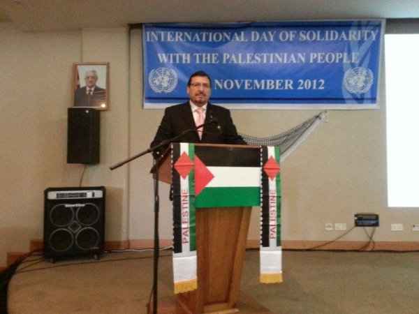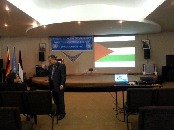 في كلمته الترحيبية بالحضور اكد سفير دولة فلسطين هاشم الدجاني على الحقوق الوطنية الفلسطينية الثابته وعلى مسؤولية المجتمع الدولي الاخلاقية لدعم حقنا في الحرية والاستقلال وحق تقرير المصير وعبر عن تقديره لزيمبابوي رئيسا وحكومة وشعبا على دعمها المتواصل لعدالة قضيتنا الوطنية ، خاصة ما مثله موقفها في الامم المتحدة حين تبنت مع الدول الصديقة مشروع القرار التاريخي الخاص برفع مكانة فلسطين الى عضو مراقب ، هذا والقت السيدة تفادوا موالي كلمة الامين العام للامم المتحدة بهذه المناسبة.