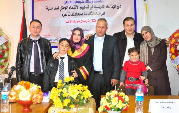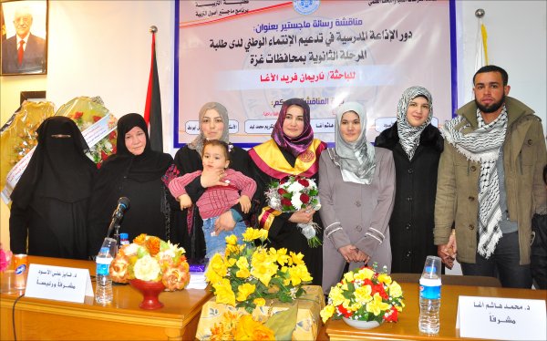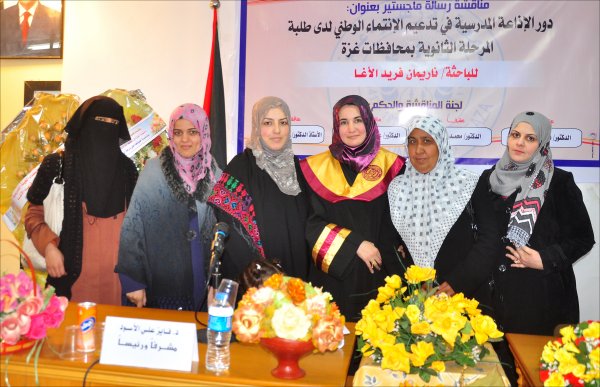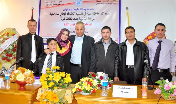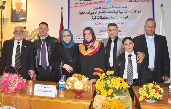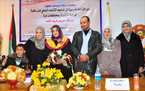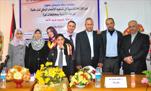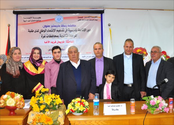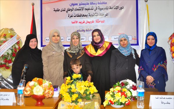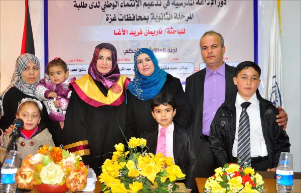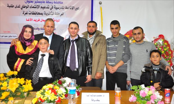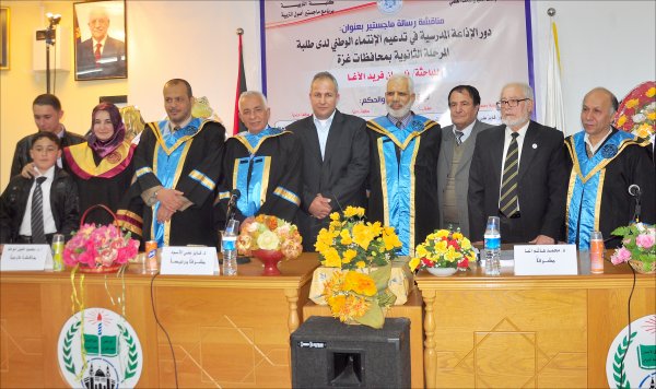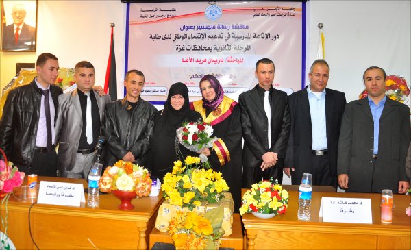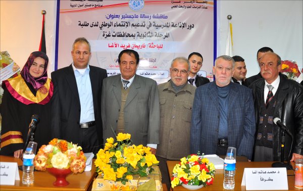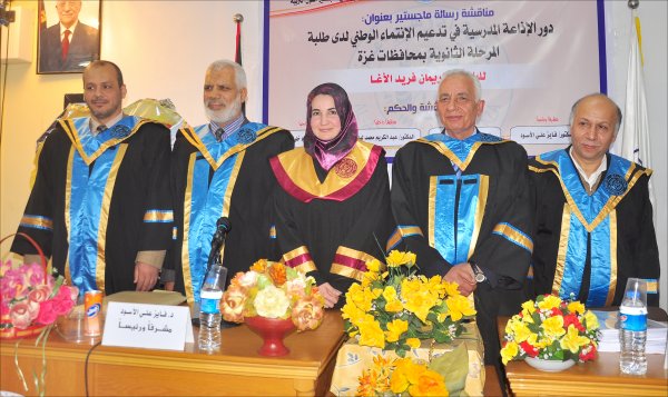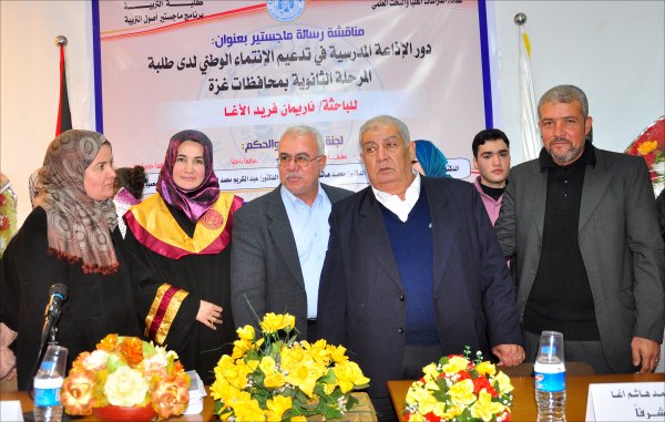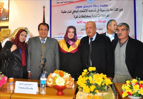 قاعة المؤتمرات- الكتيبة- برنامج ماجستير أصول التربية- جامعة الأزهر بغزة- الإثنين الموافق 31-12-2012، تم بحمد الله وتوفيقه مناقشة رسالة ماجستير للباحثة ناريمان فريد حمدان الأغا ونيلها على درجة الماجستير بعنوان دور الإذاعة المدرسية في تدعيم الإنتماء الوطني لدى طلبة المرحلة الثانوية بمحافظات غزة وقد تكونت اللجنة من: