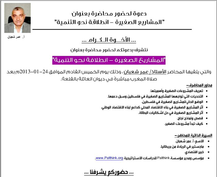 الرئيسة/محاضرات وندوات/دعوة لحضور محاضرة بعنوان المشاريع الصغيرة- إنطلاقة نحو التنمية محاضرات وندوات دعوة لحضور محاضرة بعنوان المشاريع الصغيرة- إنطلاقة نحو التنمية تاريخ النشر : الأحد | 20-01-2013 | 16:02 6791 يمكنك تلقي أحدث الأخبار أول بأول بانضمامك لإحدى مجموعات الواتساب الخاصة بالعائلة من خلال الضغط هنـا اظهر المزيد