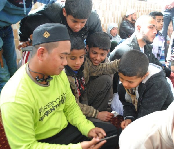 احد افراد الوفد الماليزي يقوم باطلاع الاطفال على بعض الصور