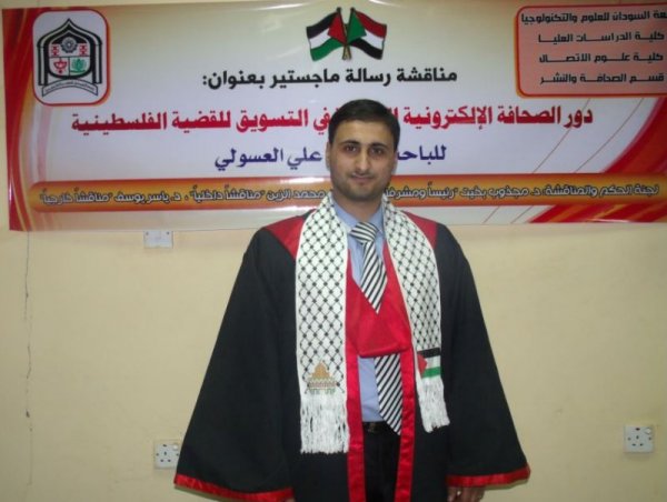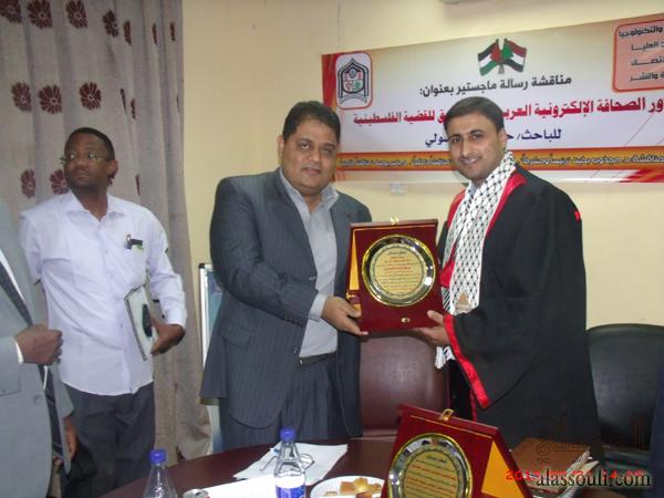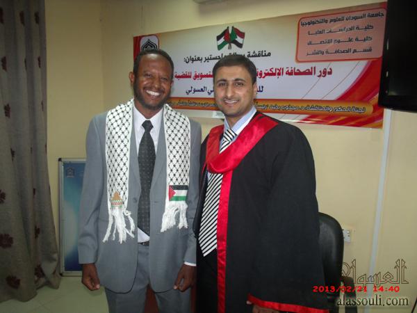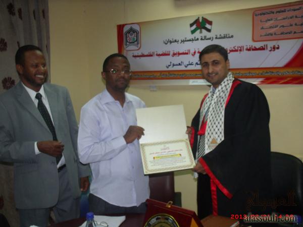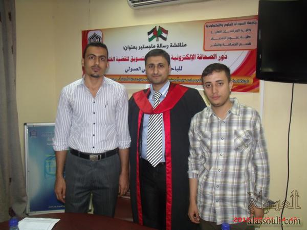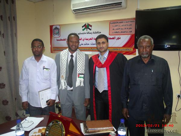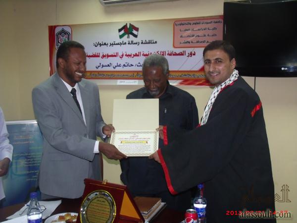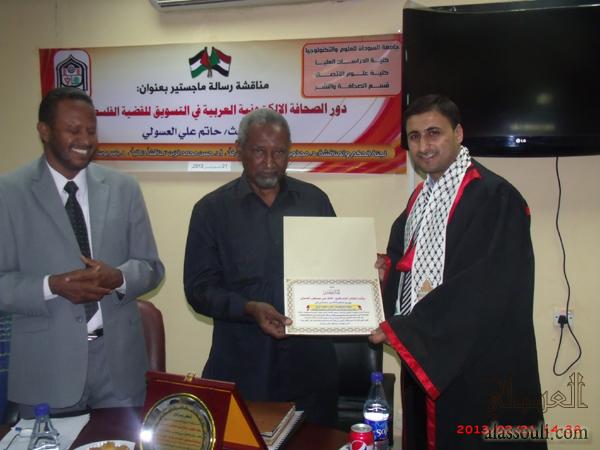 الخرطوم- منحت جامعة السودان للعلوم والتكنولوجيا الباحث الأستاذ الصحفي/ حاتم علي مصطفى العسولي درجة الماجستير في علوم الاتصال تخصص "الصحافة والنشر"، وذلك بعد مناقشة رسالته التي قدمها للحصول على درجة الماجستير في علوم الاتصال، والتي حملت عنوان: "دور الصحافة الإلكترونية العربية في التسويق للقضية الفلسطينية" دراسة تطبيقية على وكالة معاً الإخبارية للفترة من يناير 2010م إلى يناير 2012م.