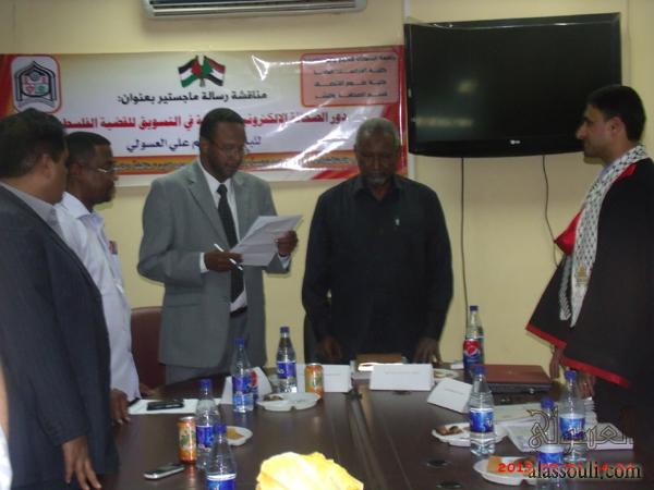 وتكونت لجنة المناقشة والحكم: من الدكتور مجذوب بخيت "مشرفاً ورئيساً" والدكتور ياسر يوسف "مناقشاً خارجياً" والبروفيسور حسن محمد الزين "مناقشاً داخلياً"، وتمت المناقشة مساء أمس الخميس الموافق: 21/2/2013م في قاعة الاجتماعات بكلية علوم الاتصال في الجامعة، بحضور القائم بأعمال سفارة دولة فلسطين في الخرطوم الدكتور نزار الأخرس.