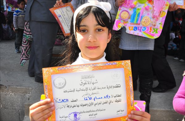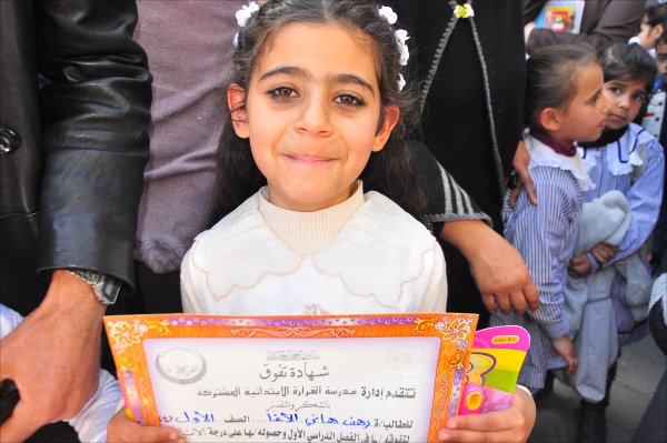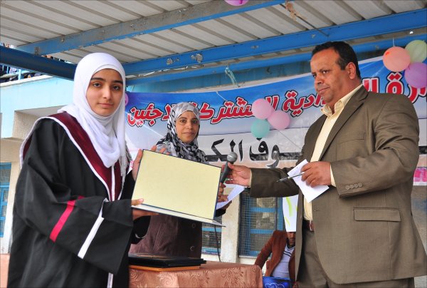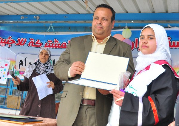 الطالبة هيا بسام محمد الأغا الأولى على مستوى تاسع تتسلم شهادتها