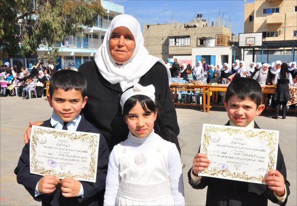 الحاجة أم هشام وأحفادها المتفوقين عبدالله هشام، ولاء عصان، عبدالرحمن هشام الأغا