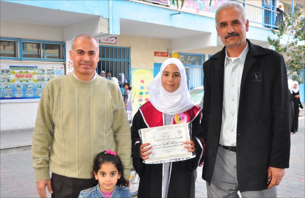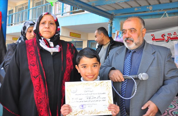 أ. عيسى شامية، المتفوق أحمد خالد الأغا، أ. فيفي البياري مديرة المدرسة