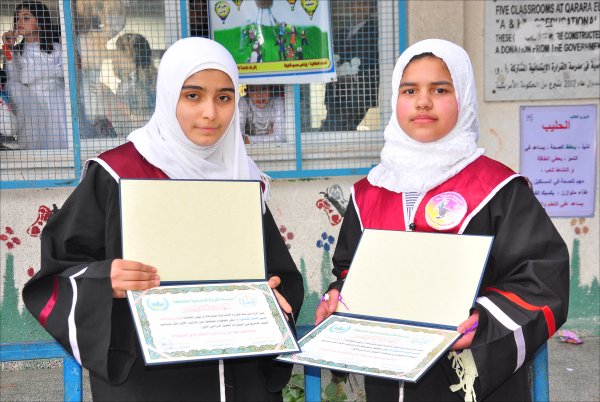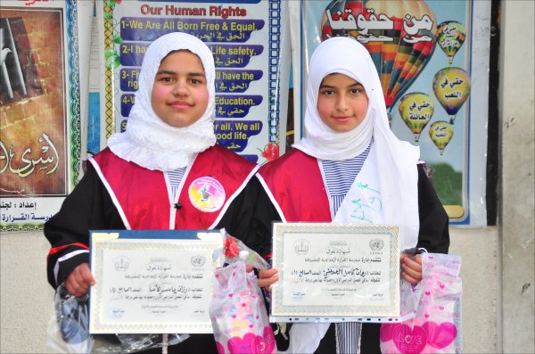 الطالبة المتفوقة روان العديني، وصديقتها الطالبة المتفوقة رزان ياسر الأغا