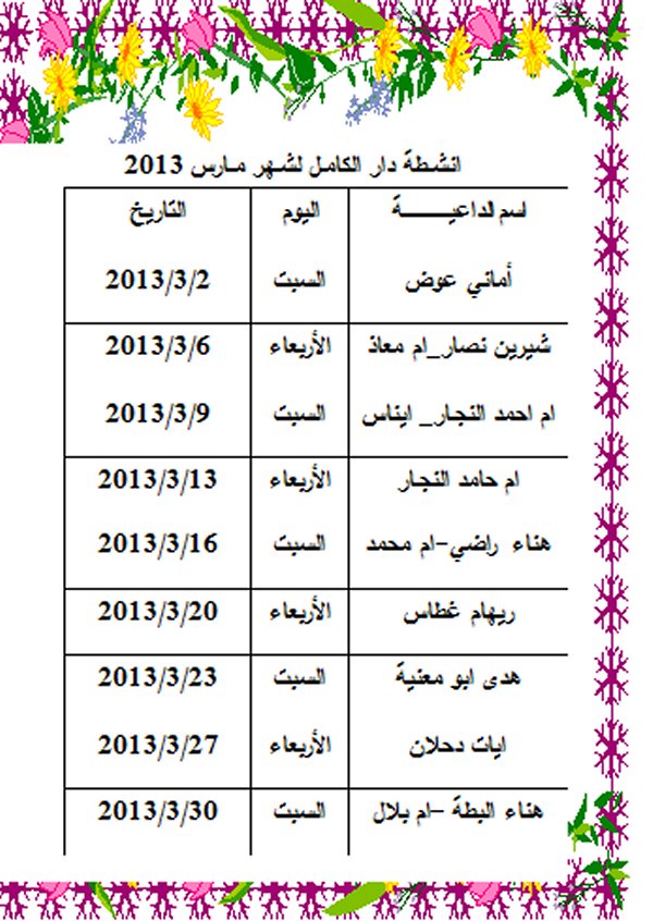 الرئيسة/دار الكامل/أنشطة دار الكامل لشهر مارس دار الكامل أنشطة دار الكامل لشهر مارس تاريخ النشر : الجمعة | 01-03-2013 | 03:31 10284 اضغط هنا للتواصل أو التعرف على أ. محمد كامل عبدالرحمن سليم الأغا يمكنك تلقي أحدث الأخبار أول بأول بانضمامك لإحدى مجموعات الواتساب الخاصة بالعائلة من خلال الضغط هنـا اظهر المزيد