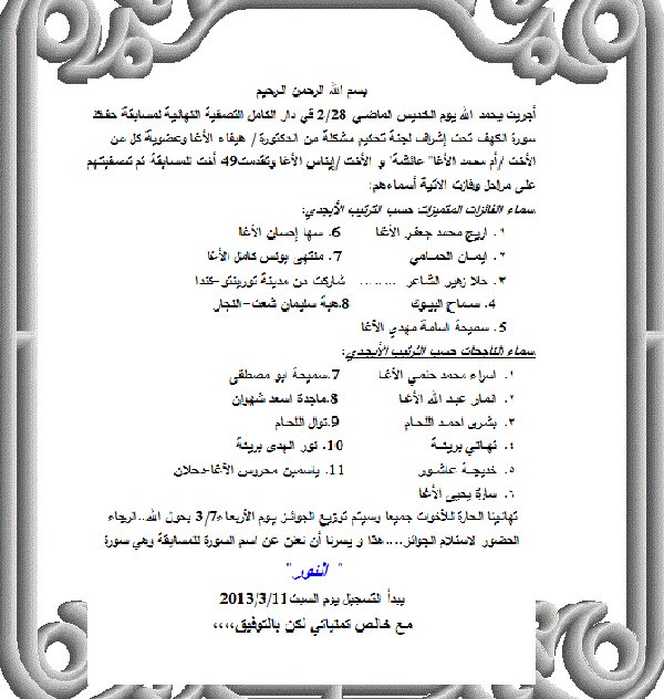 دار الكامل- الخميس 28/2/2013 أجريت بحمد الله الخميس الماضي التصفية النهائية لمسابقة حفظ سورة الكهف، تحت إشراف لجنة تحكيم مكونة من: